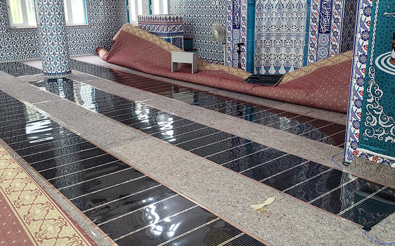 Halı altı ısıtma sistemleri, zeminden yayılan sıcaklıkla cami içerisindeki sıcaklığı dengeler ve ibadet edenlere daha rahat bir ortam sunar.
